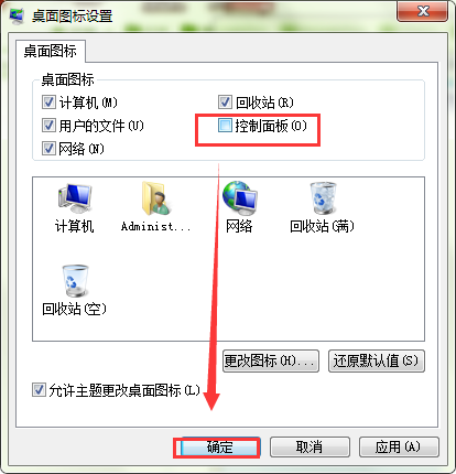 3、打开“桌面图标设置”窗口后,勾选“控制面板”,再点击“确定”。如图所示: