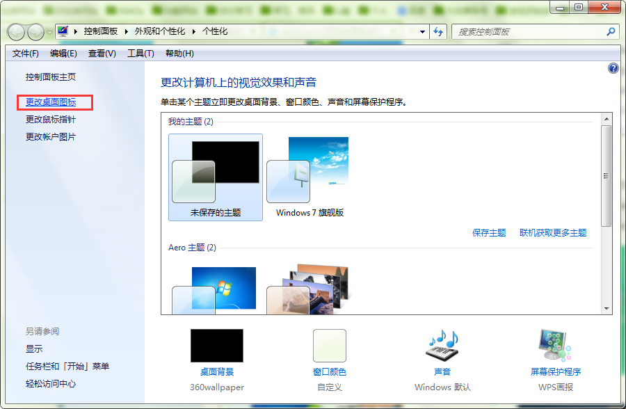 2、打开“个性化”窗口后,点击窗口左侧的“更改桌面图标”选项。如图所示:
