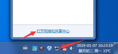 1、首先,展开桌面右下角联网图标,点击“打开网络和共享中心”选项进入;