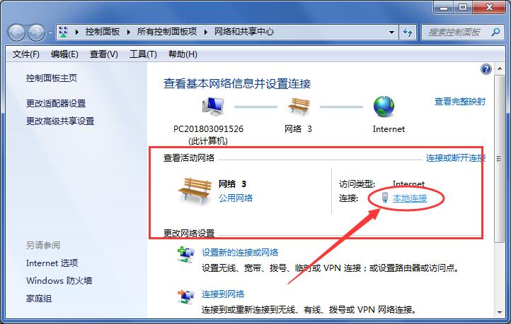 2、在查看活动网络区域中,找到“本地连接”蓝色字体,点击进入;