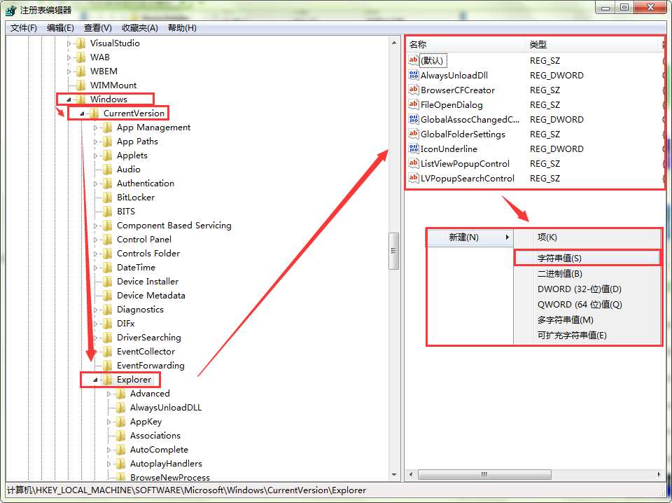 2、打开“注册表编辑器”后,依次打开“HKEY_LOCAL_MACHINE”——“SOFTWARE ”——“ Microsoft ”——“ Windows ”——“ CurrentVersion”——“ Explorer”。然后在“注册编辑器”窗口“ Explorer”选项右侧,找到键值名为Max Cached Icons。如果没有此选项,则需要新建一个名为“Max Cached Icons”的字符串值。(右击鼠标,选择“新建”——“字符串值”,然后输入命名)如图所示: