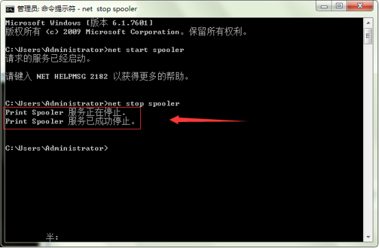 关闭服务命令,按Enter键执行命令:net stop Spooler: