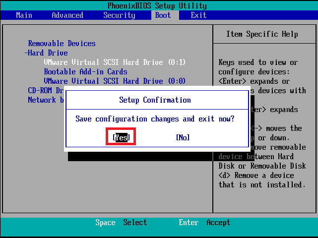 3、在打开的BIOS设置中,选择“Boot”下的选项“-Hard Drive”,然后按“↓”方向键到“UMware Virtual SCST Hard Drive(0:1)”;