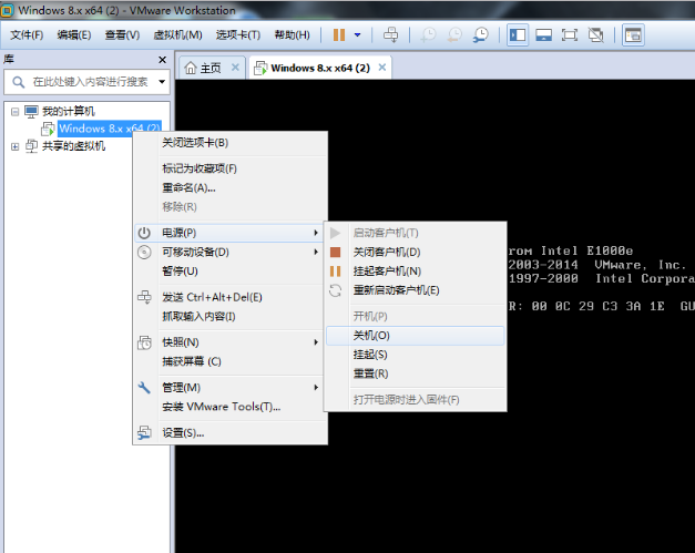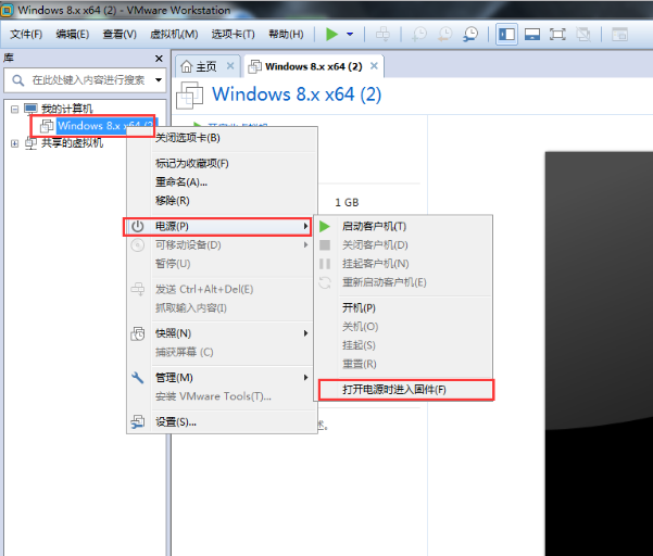 2、“关闭”了虚拟机后,再将鼠标光标放置于虚拟机上,在显示窗口选择“电源”然后再选择“打开电源时进入固件”;