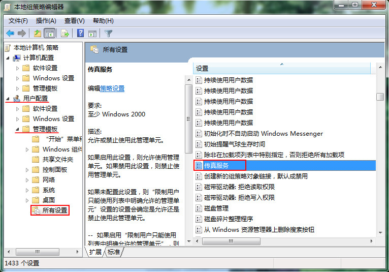 3、打开本地组策略编辑器,依次展开“用户配置——管理模板——所有设置”文件夹,接着从右侧找到并双击打开“传真服务”项,如图所示: