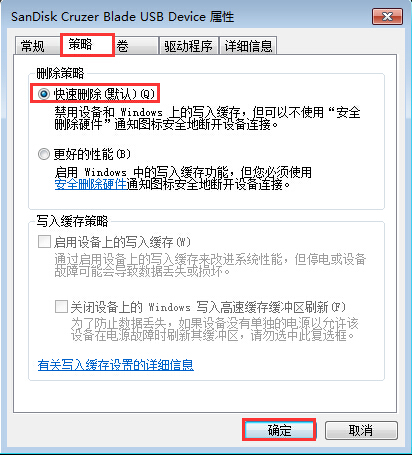 4、在属性界面中,点击“策略”,然后点选“快速删除”,然后点击下方的“确定”,如图所示: