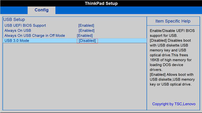 30,40,50系列机型,在BIOS中-Config-USB-USB3.0 Mode 将默认的Auto选项更改为Disabled后再按F10保存即可。