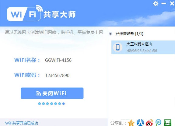 3、点击“创建免费WiFi”按钮之后,用手机或其他移动设备搜索界面上WiFi网络,输入相应的密码即可免费上网了。