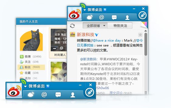 新浪千万巨资打造的微博桌面客户端,不需要开网页直接进微博。微博桌面是新浪官方开发的一款适用于Windows操作系统的微博客户端,以微薄之力,让微博更好!
